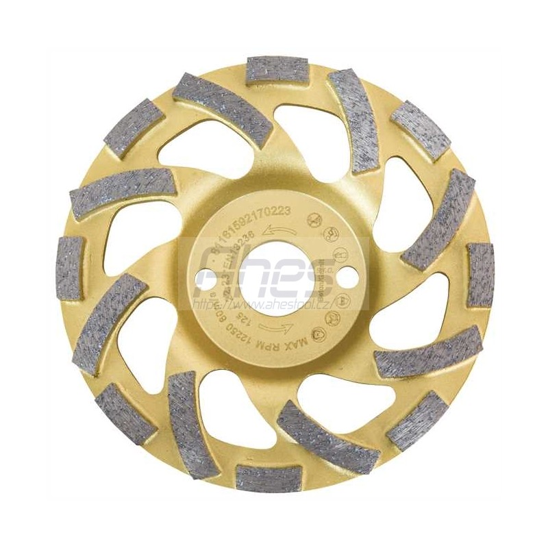 určeno pro odstraňování umělé hmoty, termoplastů a betonových podkladů na středně tvrdých a tvrdých podlahách, agresivní při úběru, výška segmentu 6,5mm, zrnitost 16/20, střední pojivo, otvor 22,2mm, výška hrnce 23mm, Ø180mm