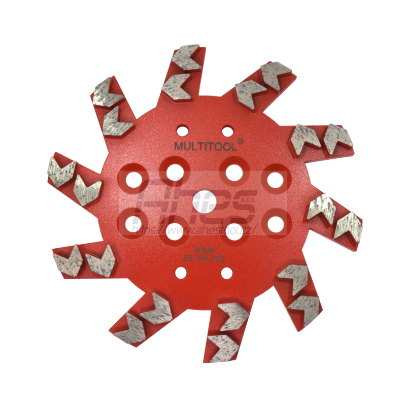 je určený na normální beton/potěr, středně měkké pojivo, vysoká kvalita, pro suché i mokré broušení, univerzální připojení se středovým otvorem o Ø19mm a pro připojení M10, 20 šipkových segmentů, Ø250mm, zrnitost 18/20, výška segmentu 10mm