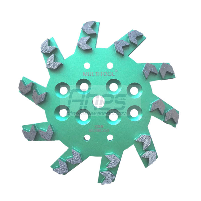 je určený na tvrdý beton/potěr, měkké pojivo, vysoká kvalita, pro suché i mokré broušení, univerzální připojení se středovým otvorem o Ø19mm a pro připojení M10, 20 šipkových segmentů, Ø250mm, zrnitost 18/20, výška segmentu 10mm