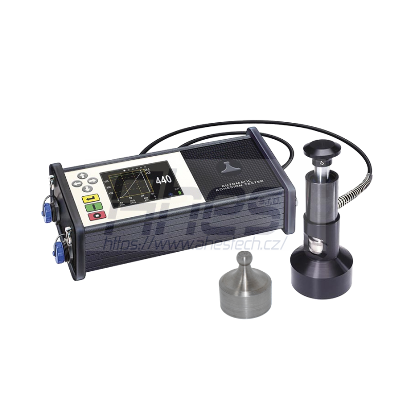 automatické testovací zařízení na zjišťování odtrhové přilnavosti nátěrů na kovu, dřevě, betonu a jiných masivních podkladů, s 50 mm razítkem dle ASTM C1583 a ZTV-ING pro beton, mazaninu (třída 1 dle DIN 51220) a DIN EN 1542, přístroj měří pomocí hydraulického tlaku sílu, která je zapotřebí k tomu, aby se uvolnila od podkladu určená specifická oblast nátěru, tlak je vytvořen automaticky díky elektronicky regulovanému hydraulickému čerpadlu a objeví se na velké dotykové obrazovce, chybovost vzniklá uživatelem jsou díky automatice vyloučena, vhodný pro laboratoř a stavbu, neboť je stabilní, dobře manipulovatelný a poháněn akumulátorem, spojení bluetooth ke smartphonu App (iOS & Android), USB přípoj a Wi-Fi k přenosu dat a k uchovávání zobrazení lomu, ukládání naměřených hodnot pro 100 000 měření až do 1 000 bloků, uživatel si zvolí četnost zkoušek odtrhu, hraniční hodnotu odtrhu a dobu odtrhu, automatické provedení testu, postupné zvyšování síly pomocí elektronicky regulovaného čerpadla, volitelné jednotky – MPa, psi, N/mm², N, rozsah měření 0–3,8 MPa (vztahuje se na 50mm Dolly) odpovídá normě ISO 4624/16276-1, ASTM D4541/D7234, AS/NZS 1580 a ZTV-ING pro beton, mazaninu (třída 1 dle DIN 51220) a DIN EN 1542, s rotujícím zobrazením na dotykové obrazovce, dle zaměření AT-A, stabilní dotyková obrazovka je odolná proti poškrábání a proti úderu, ochranná třída IP65, unikátní kulovitá hlava Dolly je držena spojkou s kuličkovým ložiskem a zajišťuje díky tomu vždy ten správný směr, Technická data: rozsah měření 0… 20MPa (N/mm²), rozlišení 0,01MPa (1 psi), přesnost ±1 % (celý rozsah měření), napájení proudem a akumulátorem, rozměry 400×200×150mm, hmotnost 5,5kg