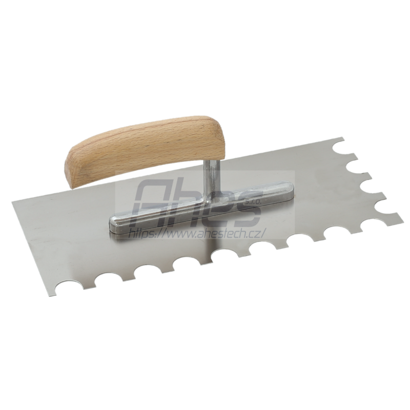 nerezové ozubené hladítko s půlměsícovým zubem, zvláště vhodné pro pokládku velkých obkladaček, rukojeť je vyrobena z nelakovaného přírodního dřeva, které se lépe drží v ruce a neklouže,, síla plechu 0,75mm, šířka 130mm, délka 280mm