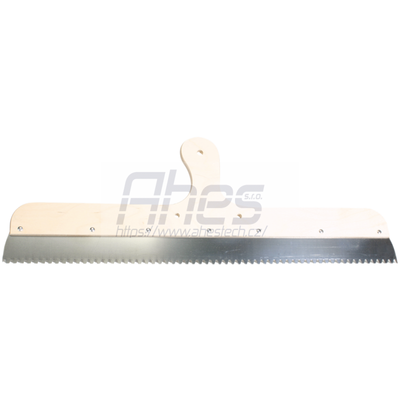 nerezová stěrka se používá k nanášení a roztírání podlahového materiálu ve stoje a to za pomocí násady (kat.č. 30.324.140), kdy se stěrka tlačí před sebou a díky tomuto pohybu je práce méně namáhavá na záda, má předvrtané otvory pro hliníkový držák násady (kat.č. 30.300.024, 30.300.129), šířka 600mm, ozubení 6x4mm (hloubka x odstup)
