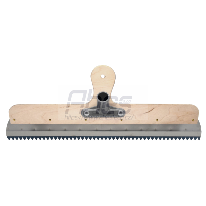 nerezová stěrka, se svorkovnicí k připevnění ozubených lišt, stěrka slouží k nanášení a roztírání podlahového materiálu ve stoje a to za pomocí násady (kat.č. 30.324.140), kdy se tlačí před sebou a díky tomuto pohybu je práce méně namáhavá na záda, stěrka má předvrtané otvory pro hliníkový držák násady (kat.č. 30.300.024, 30.300.028, 30.300.129), délka 560mm, balení se standardním držákem násady Ø28mm (Kat.č.:30.300.028), (balení bez ozubené lišty)