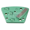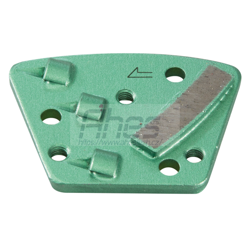 tento zelený diamantový PKD 1/4 segment je pravotočivý, destička je opatřena zuby PKD o výšce 4mm a zahnutým diamantovým podpůrným segmentem, vyšší životnost, vysoká tepelná vodivost, jsou velice agresivní, určeny k odstraňování obtížně odstranitelných povrchů od 1mm, jako je lepidlo na kachličky, kobercová pěna, nátěry, upínač M6, připojení 3x M6 + jiné (např. Blastrac)