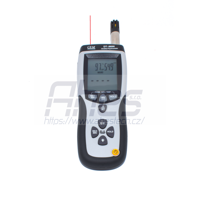 pomocí externího teplotního čidla, které je součástí dodávky, nebo pomocí infračerveného měření můžeme zjišťovat prostorové klima (teplotu v místnosti, relativní vlhkost) a také povrchovou teplotu stěn nebo výrobků. Psychrometr vám jako další informaci poskytuje rosný bod (teplotu rosného bodu) a teplotu vlhkého teploměru. Naměřené hodnoty lze přenést přímo online do PC nebo notebooku.